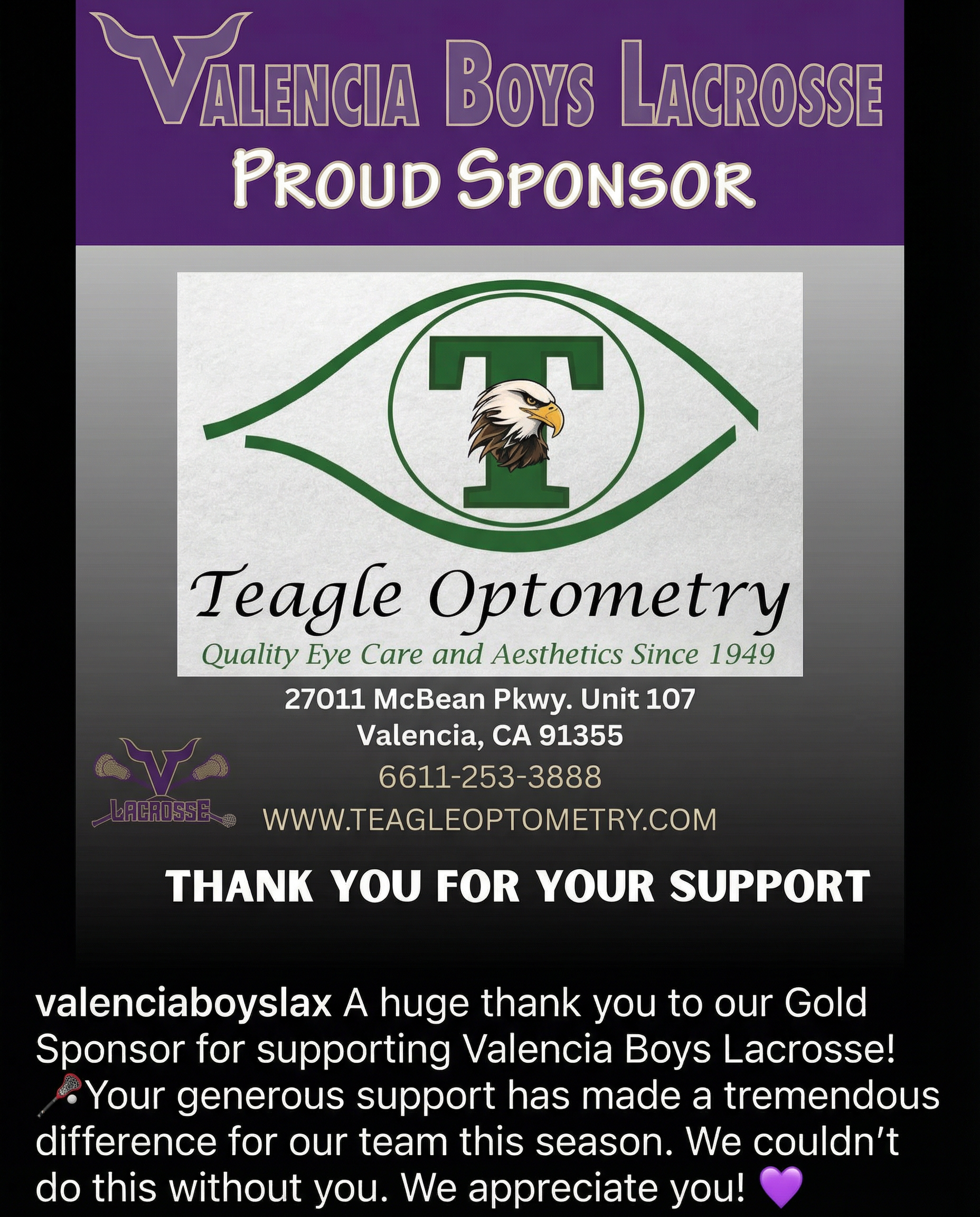 At Teagle Optometry – Promenade, community is at the heart of everything we do. That’s why we were so honored to see the heartfelt thank-you from Valencia Boys Lacrosse recognizing us as a proud sponsor.
